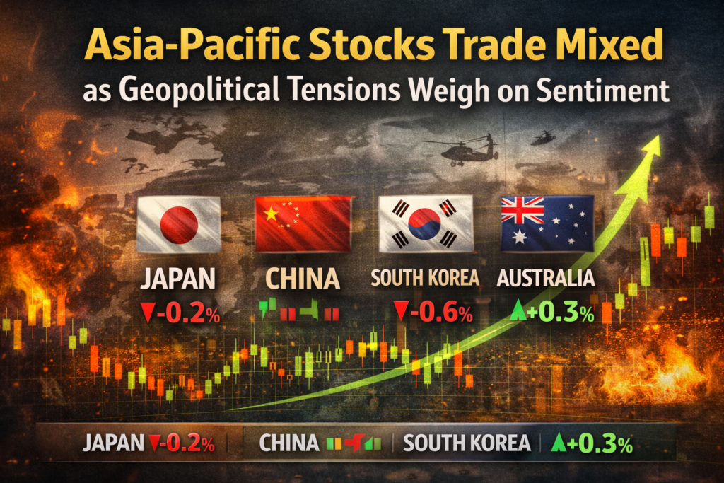 Asia-Pacific equity markets traded mixed on Wednesday as investors remained cautious amid rising geopolitical tensions and lingering global economic uncertainty. Sentiment stayed fragile, with traders closely monitoring developments that could impact risk appetite across global markets.